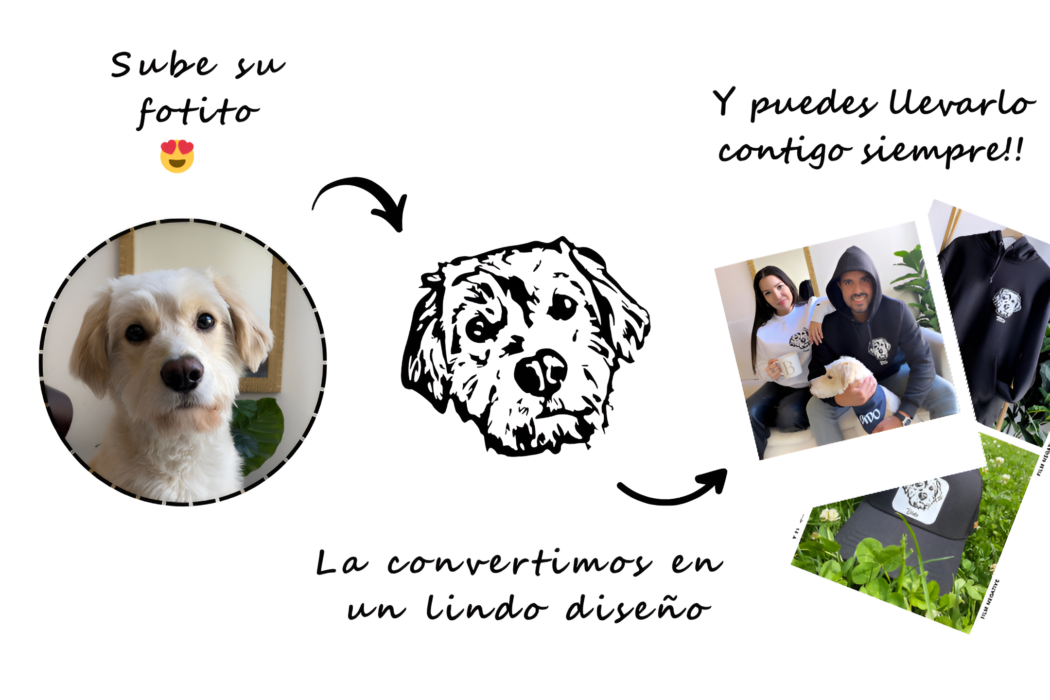 Al momento de estar en la página web, seleccionas la prenda que deseas y eliges abajo la opción que dice “una, dos o tres caritas”. Seleccionas la cantidad de peludos y subes uno por uno con su respectivo nombre.